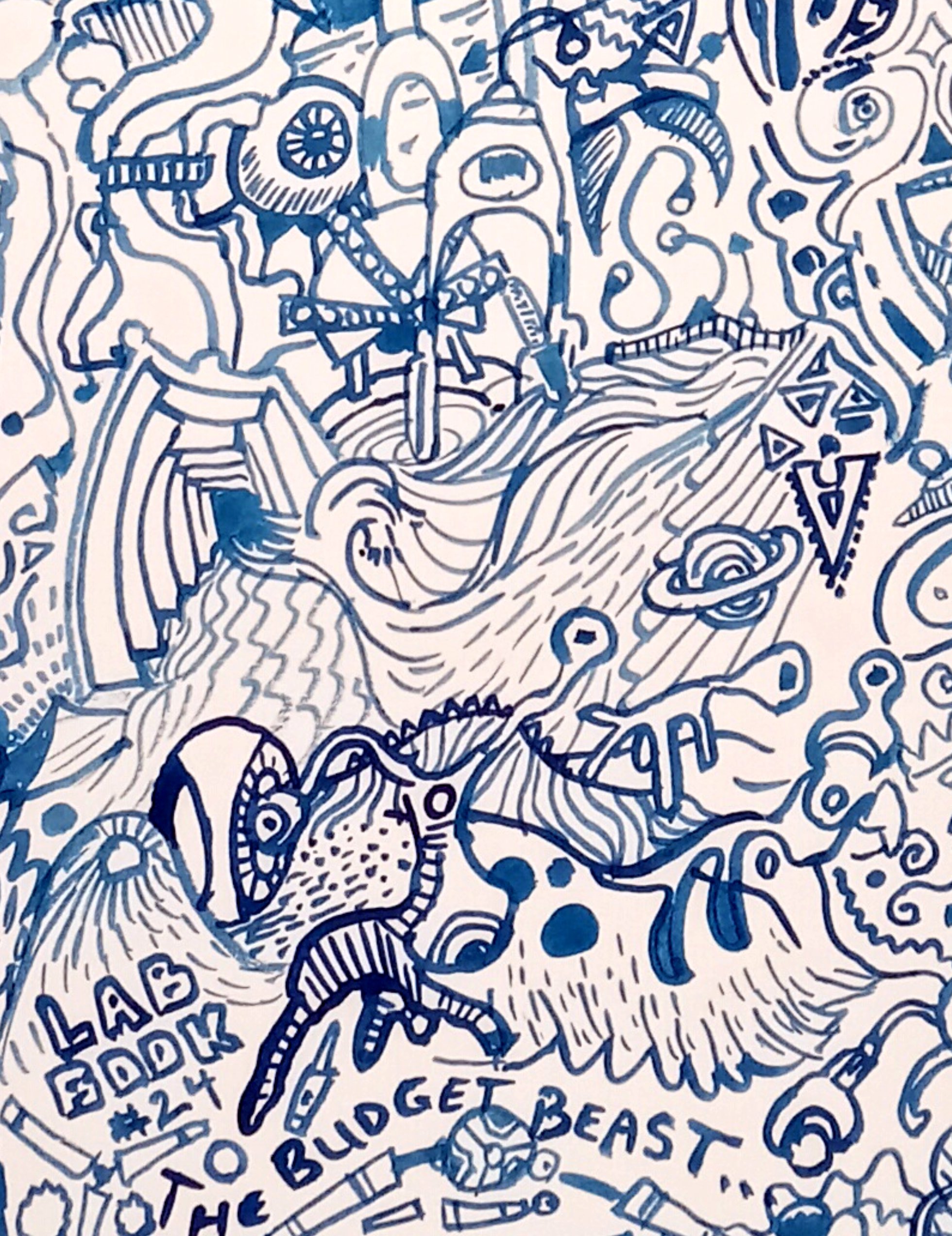 The Budget Beast: Lab Book #24, watercolour 22 x 30" Strathmore 400 series, January 2023 (No. 3355)